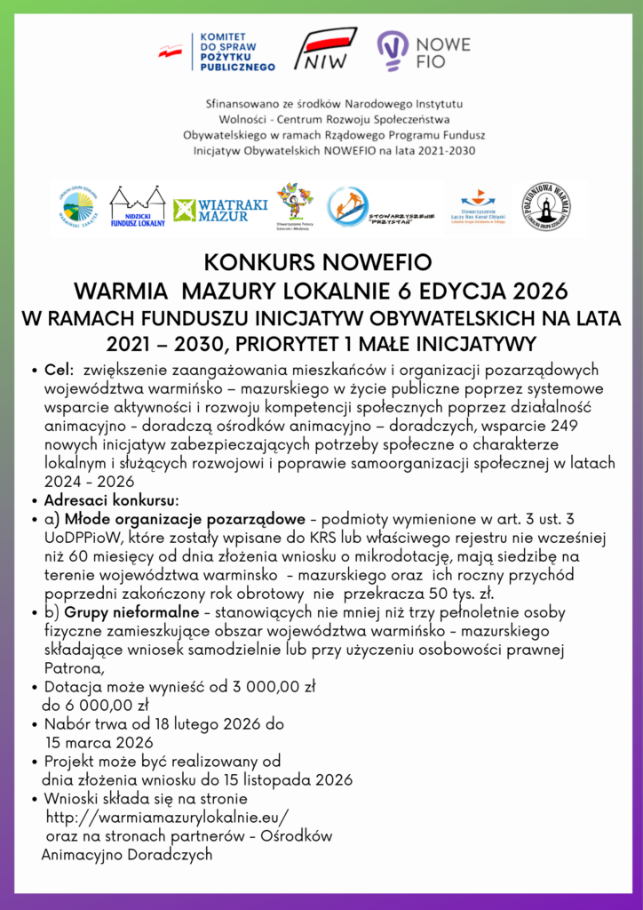 Trwa nabór wniosków w konkursie NOWEFIO – Warmia Mazury Lokalnie 2026, ale czas na zgłoszenia mija już 15 marca 2026 r.